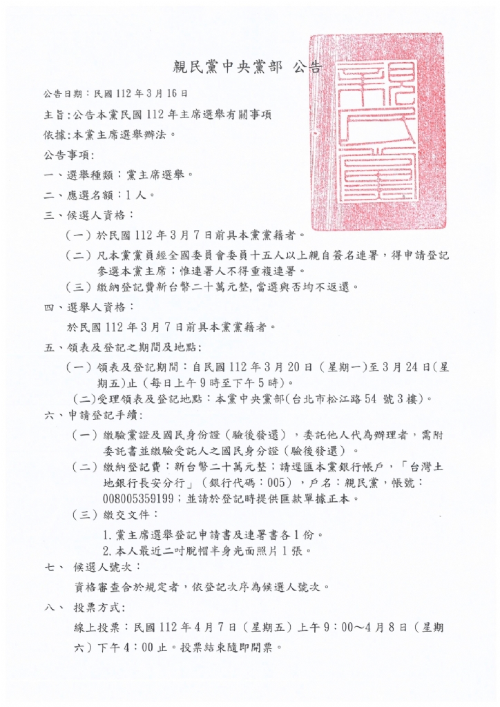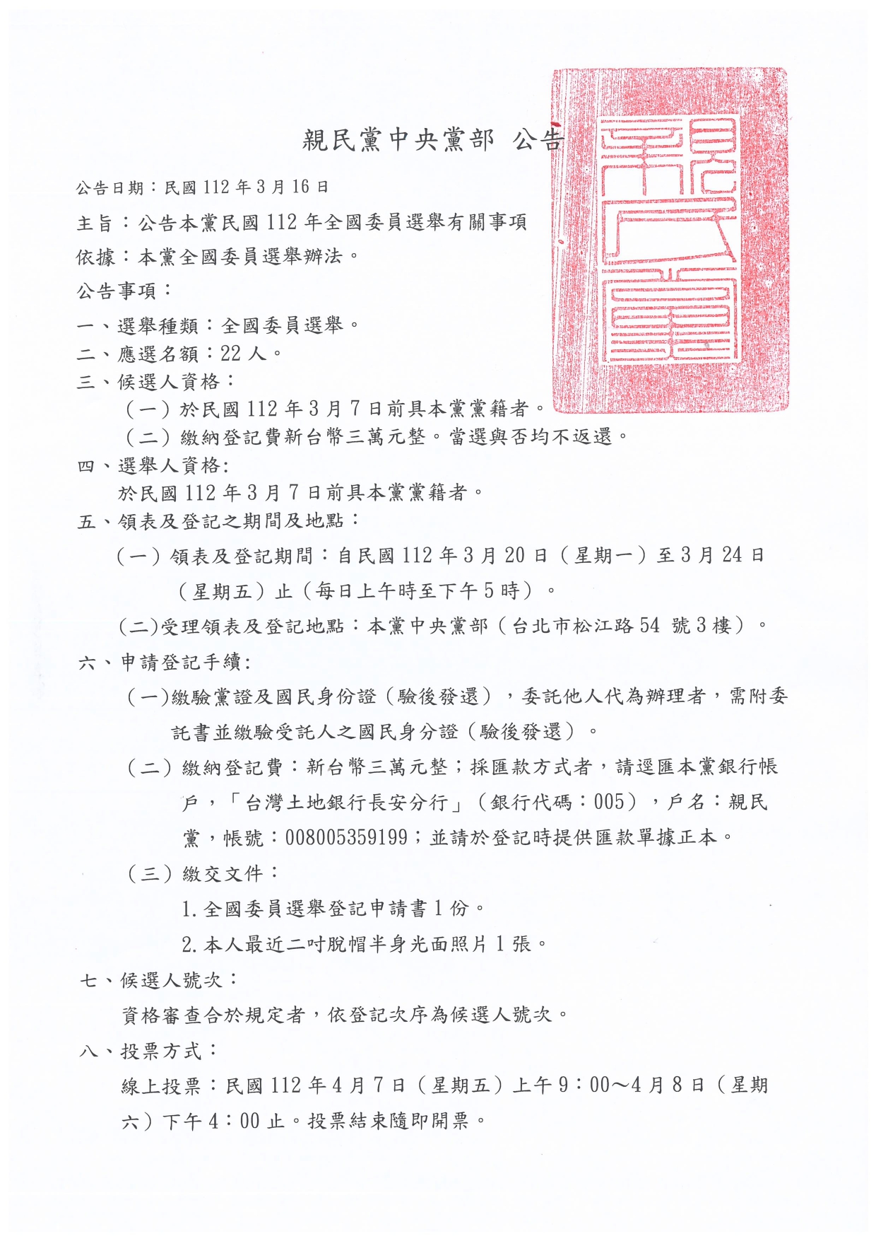 2023-03-16【112年親民黨主席暨全國委員選舉公告】
