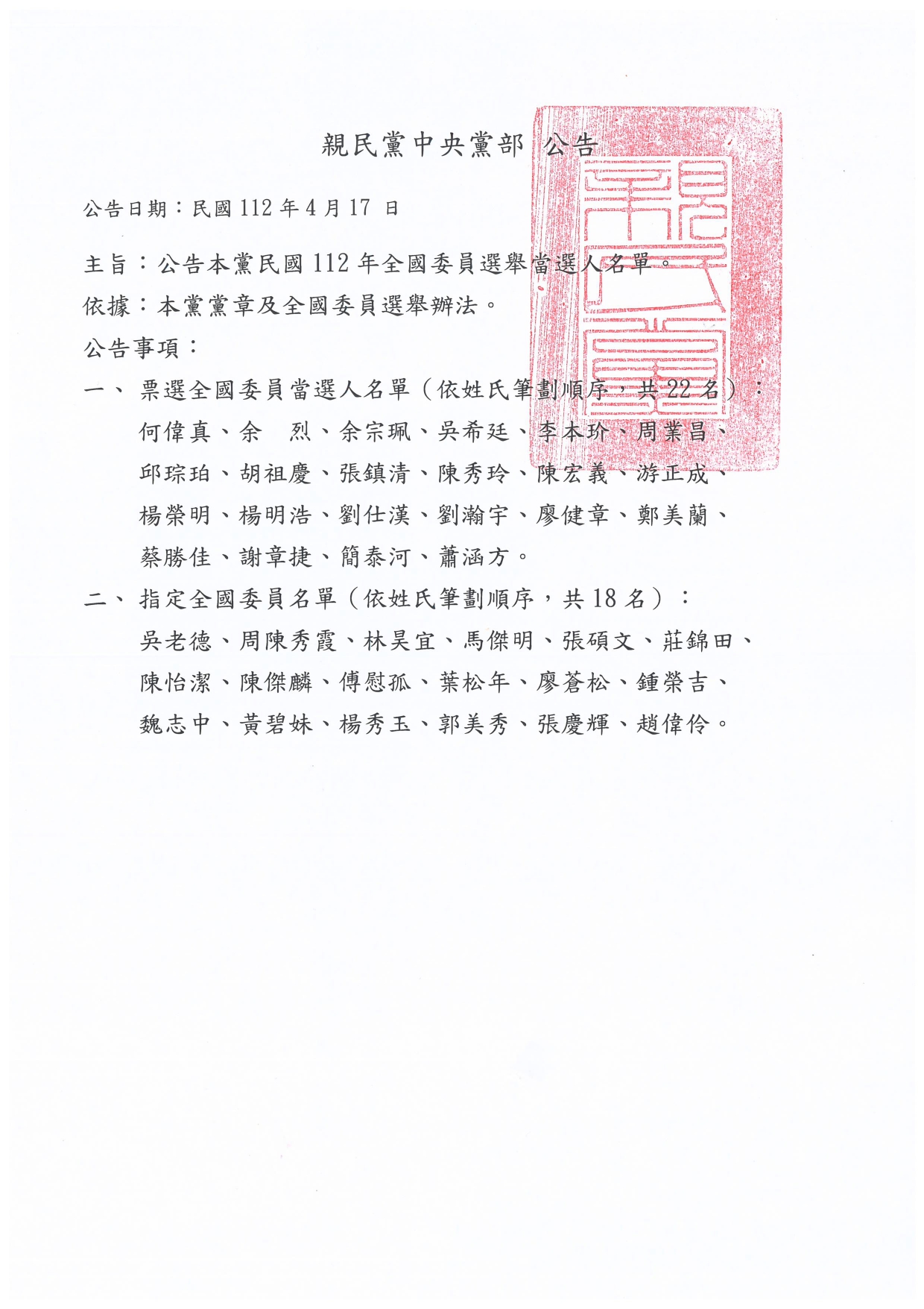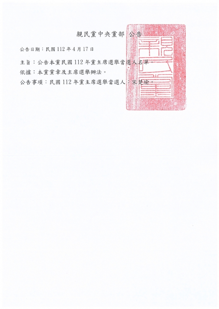 2023-04-17公告【112年親民黨主席暨全國委員當選名單】