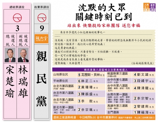 首頁 > 親民新聞館 > 最新消息 > 2012-01-12 關鍵時刻 沈默大眾 站出來 快樂投給宋林團隊 送您幸福(四大報廣告)