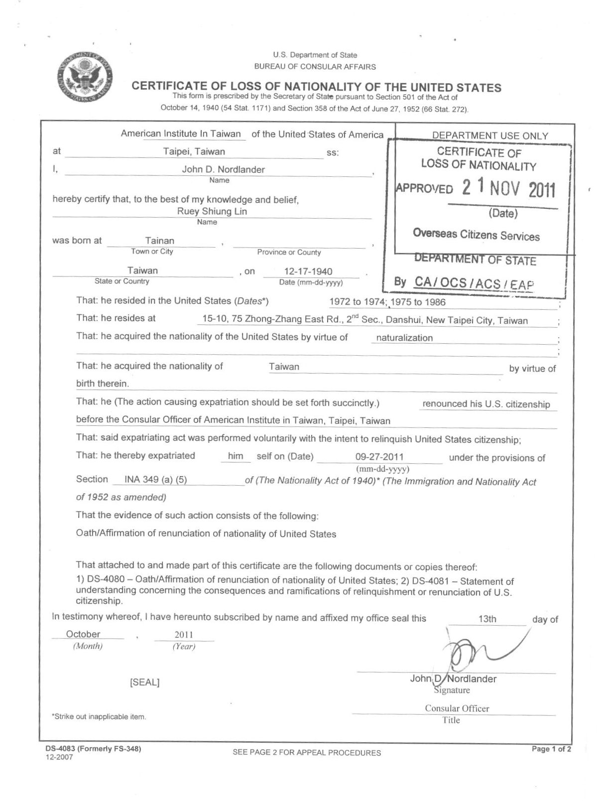 > 2011-11-25 林瑞雄院長放棄美國籍證明文件