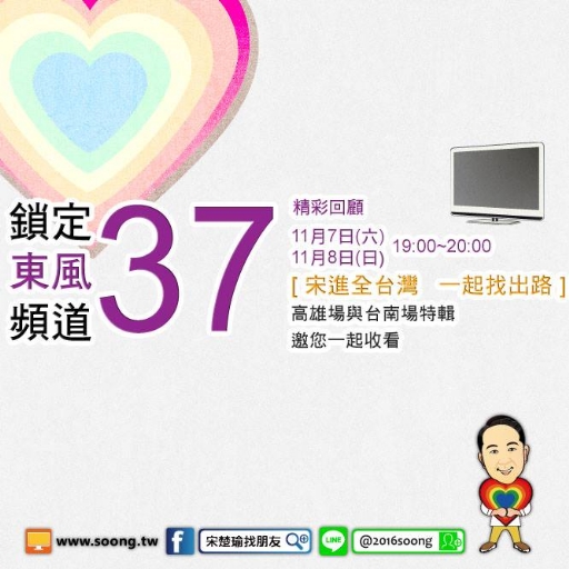 2015-11-06 明(六)後(日)一連二天19:00-20:00東風37台《宋進全台灣 一起找出路》歡迎各位好友撥冗收看 明(六)後(日)一連二天19:00-20:00東風37台《宋進全台灣 一起找出路》-分別播出高雄場與台南場特輯 歡迎各位好友撥冗收看,共同關心台灣、為自己找出路 。