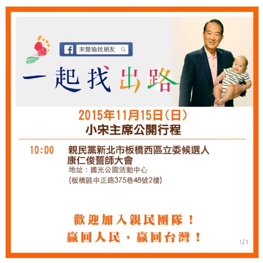 首頁 > 親民新聞館 > 最新消息 > 2015-11-15 (日) 小宋主席新北市找朋友公開行程