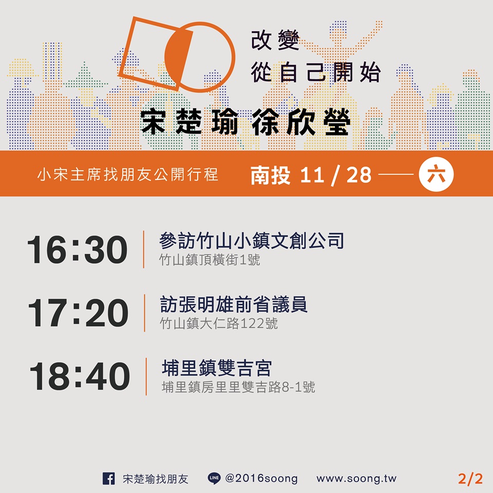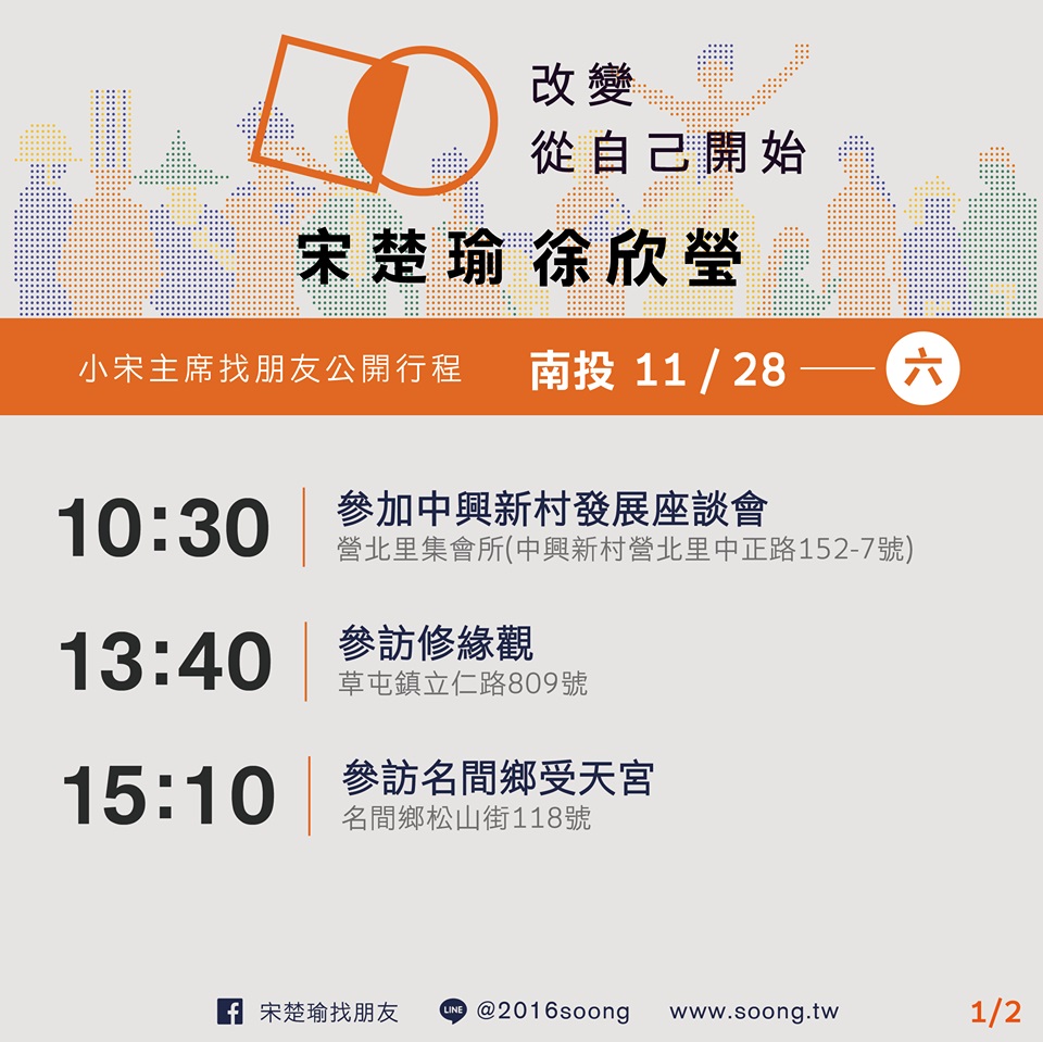 2015-11-28 (六) 小宋主席南投找朋友公開行程 10:30 參加中興新村發展座談會 地點:營北里集會所(中興新村營北里中正路152-7號) 13:40 參訪修緣觀 地點:草屯鎮立仁路809號 15:10 參訪名間鄉受天宮 地點:名間鄉松山街118號 16:30 參訪竹山小鎮文創公司 地點:竹山鎮頂橫街1號 17:20 訪張明雄前省議員 地點:竹山鎮大仁路122號 18:40 埔里鎮雙吉宮 地點:埔里鎮房里里雙吉路8-1號