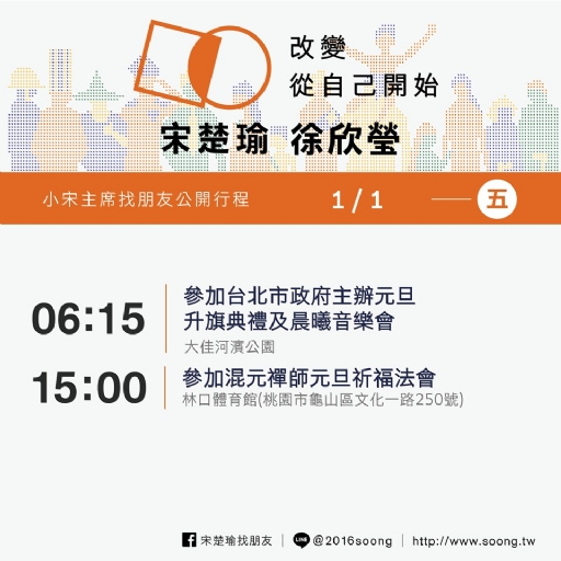 2016-01-01(五) 小宋主席找朋友公開行程 06:15 參加台北市政府主辦元旦升旗典禮及晨曦音樂會 地點:大佳河濱公園 15:00 參加混元禪師元旦祈福法會 地點:林口體育館(桃園市龜山區文化一路250號)