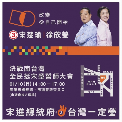2016-01-10(日) 決戰南台灣 全民挺宋瑩誓師大會 決戰南台灣 全民挺宋瑩誓師大會 時間:1月10日(日) 14:00~17:00 地點:高雄市國泰路、議會路交叉口(捷運鳳山西站) 邀請全民站出來 團結勝利換新③ 宋進總統府,台灣一定瑩! PS.15:00開始中視實況轉播