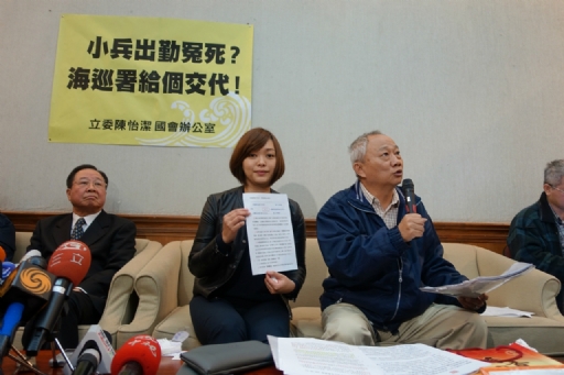 立法委員陳怡潔,2日陪同今年2月初,因在台北港區執勤時,連人帶車被海浪捲入海中,因而喪命的海巡署岸巡二二大隊義務役二兵牛俊皓家屬,召開「小兵出勤冤死 海巡署給個交代」記者會。