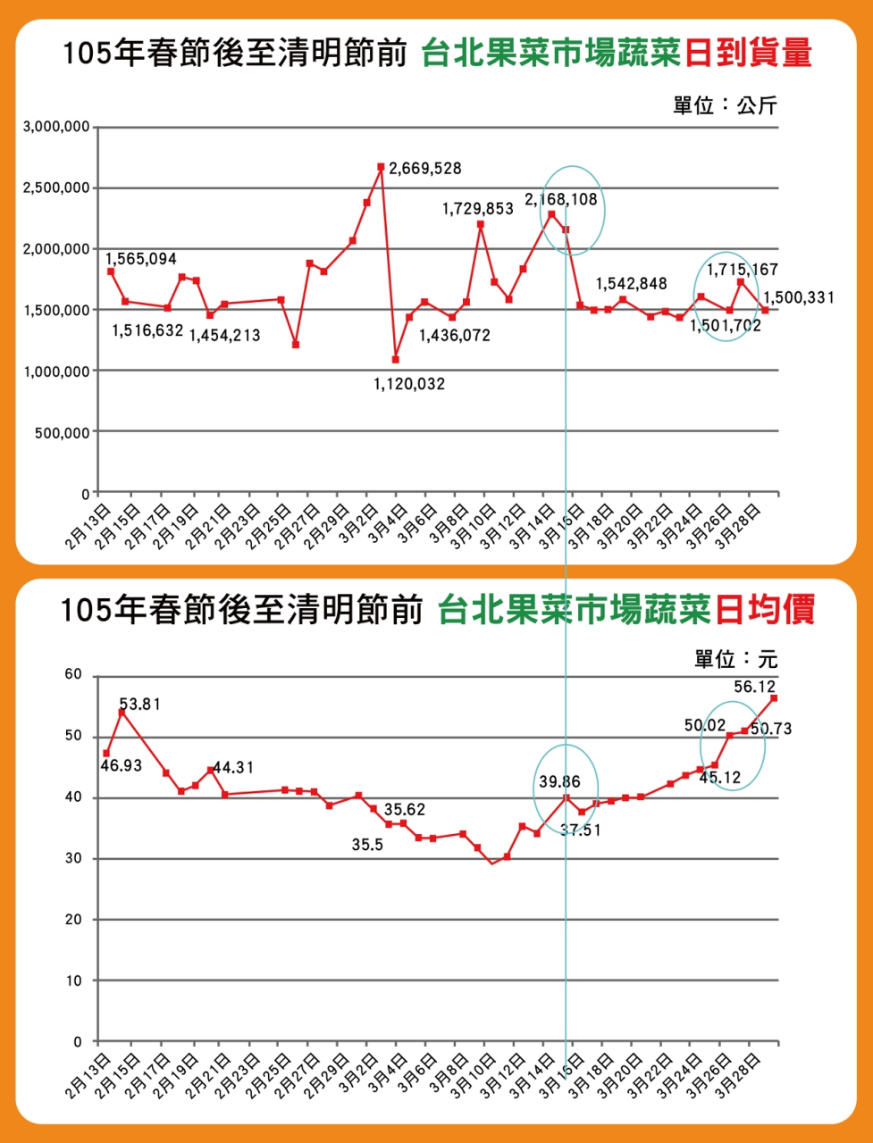 親民黨黨團總召李鴻鈞拿出統計圖表解釋,仔細比對高麗菜批發單價,與蔬菜批發均價的「量、價折線圖」,可以很清楚地發現,從3月24日高麗菜「量跌價漲」的隔天開始,連續三天出現違反經濟學法則的「價量齊揚」;也就在高麗菜異常走揚的三天後,3月27日,平均菜價飆破每公斤均價50元;3月28日市場休市,隔天3月29日刷新菜價紀錄,一舉來到每公斤均價56.12元。