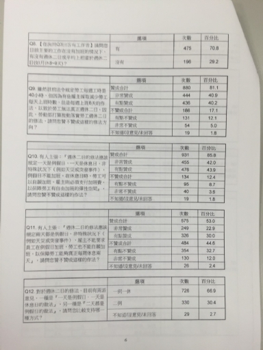 勞動部說根據民調,81.1%的民眾贊成勞動部推動落實勞工週休二日的修法;85.8%民眾贊成週休二日為「一例一休」,而「週休二例」只獲得53.0%民眾支持。但親民黨團發現,該份民調的問卷明顯隱瞞資訊,刻意誤導民眾,得出來的數據根本無法反應民意,更不能作為政策方向的依據。