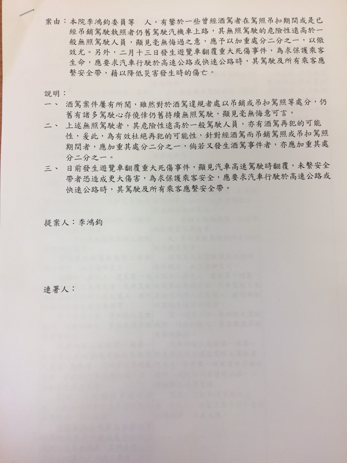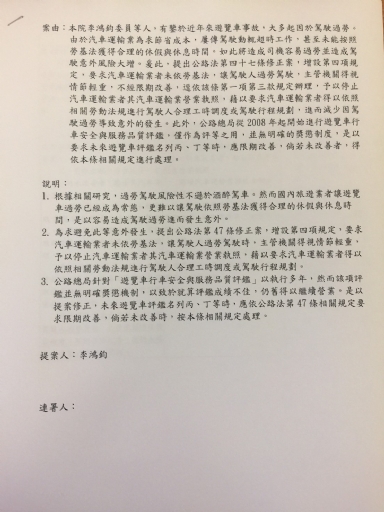日前發生遊覽車在國道翻覆的重大死亡車禍,各界推測「駕駛過勞」可能是原因之一。對此,親民黨立委李鴻鈞提出「公路法第四十七條修正草案」,增設第四項規定,若汽車運輸業者未依『勞基法』相關規定,讓駕駛人過勞駕駛,主管機關得視情節輕重,不經限期改善,直接停止汽車運輸業者營業執照,希望汽車運輸業者必須依照相關勞動法規進行駕駛人合理工時調度或駕駛行程規劃,進而減少因駕駛過勞導致意外發生的憾事。李鴻鈞同時提出「道路交通管理處罰條例修正草案」,要求汽車行駛於高速公路或快速道路時,「駕駛及所有乘客應繫安全帶」,以期交通事故發生時,將傷亡降低。