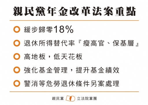(二)退休所得替代率「瘦高官保基層」:為了避免退休比工作時間領得還多,因此設計了退休所得替代率來給予限制。但即使要給予限制,也必須顧慮到年金改革的問題核心,也就是每一個退休人員都是需要具有一定老年經濟安全的保障,這份經濟安全感確實不應該因為官位的高低而在退休金上有極大的差異。因此,親民黨團的改革方案是「瘦大保小」,也就是對於高官的退休金與基層人員的退休金,可以在一定區間內浮動,但高官的調整幅度大於基層人員的幅度。