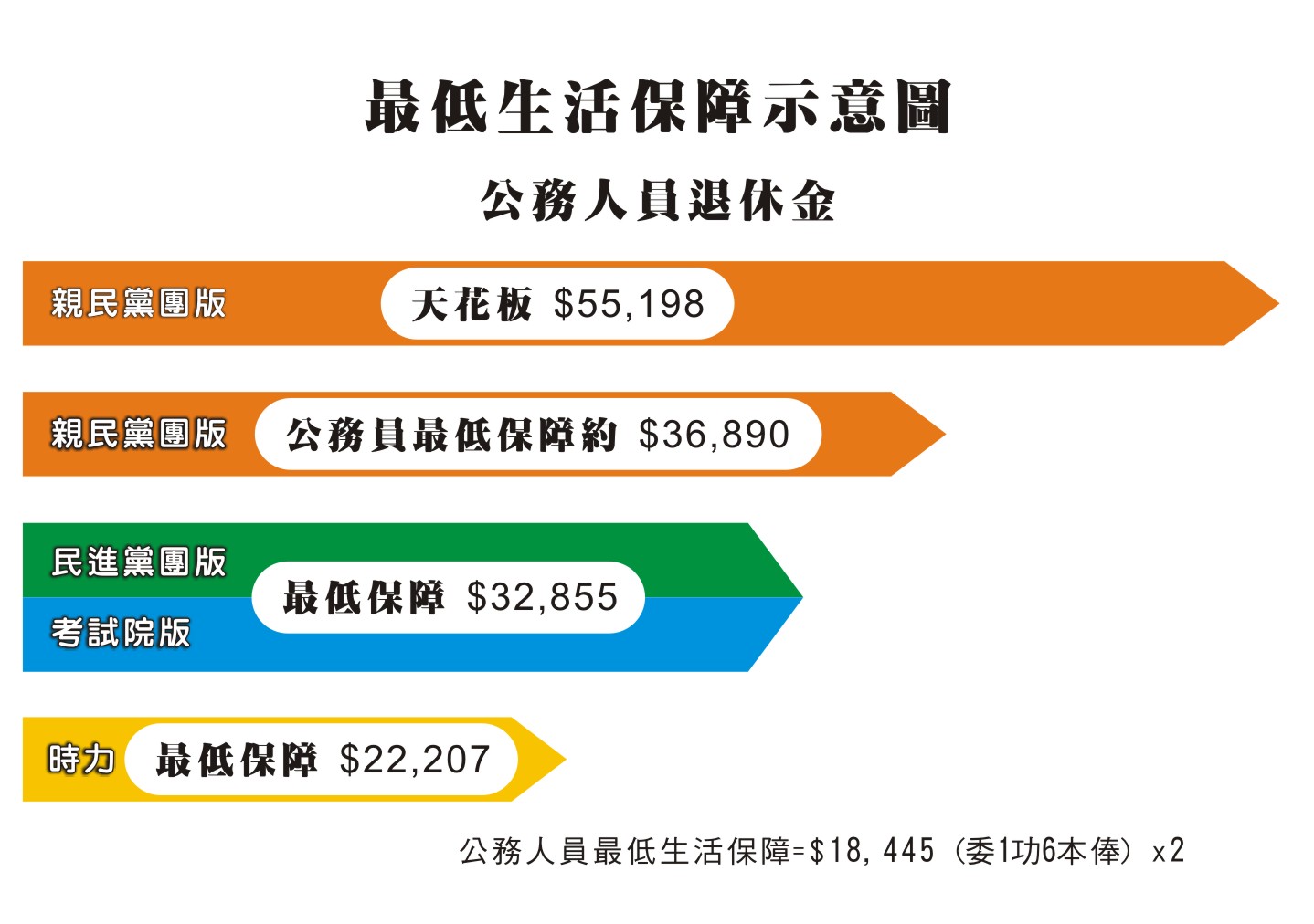 (三)高地板以保基層,低天花板以瘦高官:進行任何的改革方案,最怕的就是在改革過程中,讓經濟弱勢因改革而使得生活遭受到波及。最低生活保障制度的設計,就是為了防範這樣的問題發生,在各職業別上,依其職業的薪給條件,給予在一定條件下的經濟弱勢,不會因為改革而受到無辜牽連。另外天花板的設計也是避免分配不均的問題,因為我們認為每一位退休的國民,都應平等對待,享有老年生活的經濟安全。不會因為工作期間官位的高低而有差別,因此不論官多大,一旦退休,大家都一樣。
