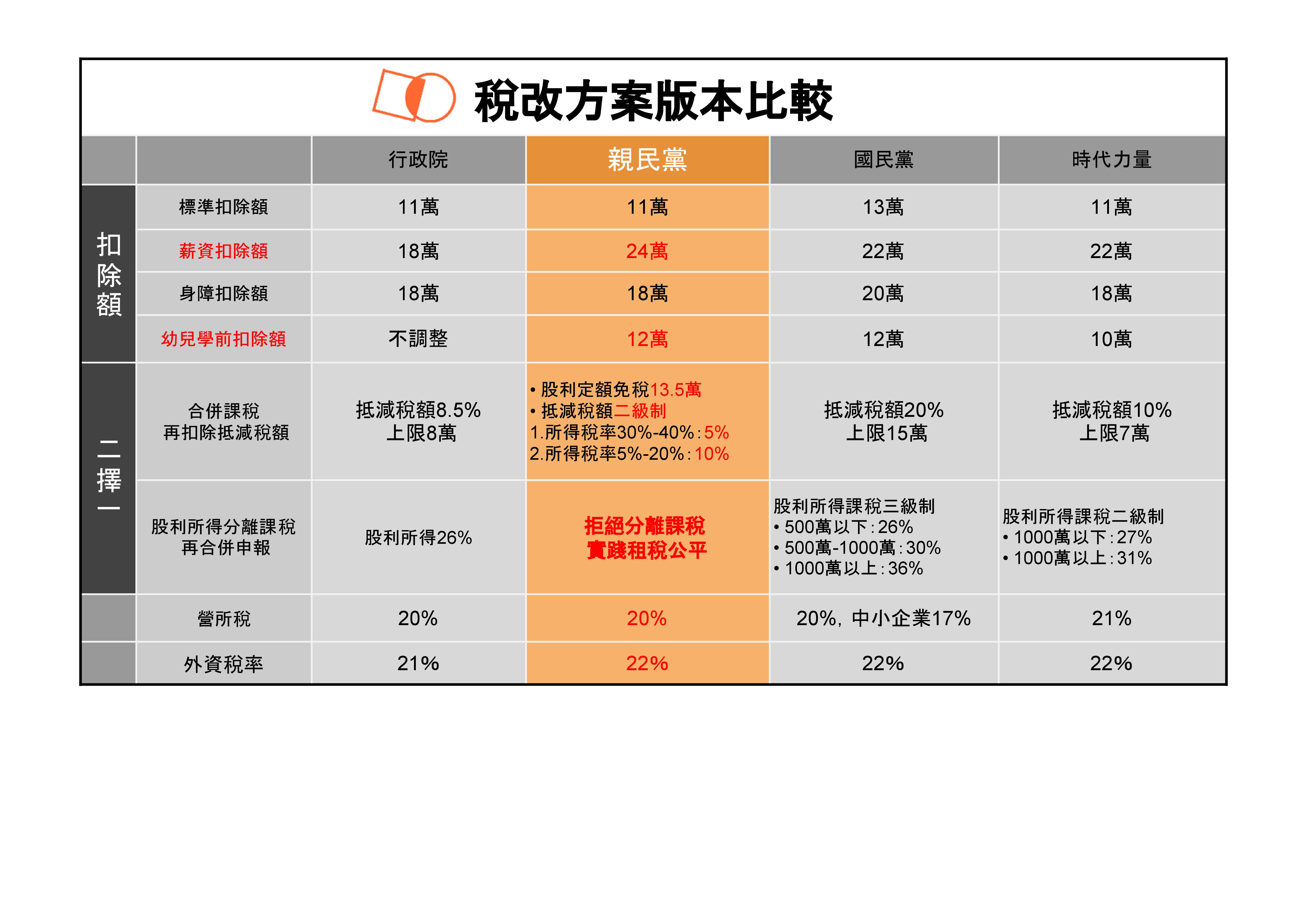 針對財政部端出的稅改方案,親民黨立法院黨團今(26)日召開記者會公布黨團版稅改方案,以「安心」為主軸,務實的回應社會需求,維護租稅公平,改善所得分配,確保投資動能等。具體來說,第一是以「合併課稅」取代「分離課稅」,避免圖利疑慮;第二是大幅拉高薪資特別扣除額,減輕中產階級負擔;第三則是對少子化危機的問題,黨團也透過提高幼兒學前特別扣除額度來協助年輕夫妻。