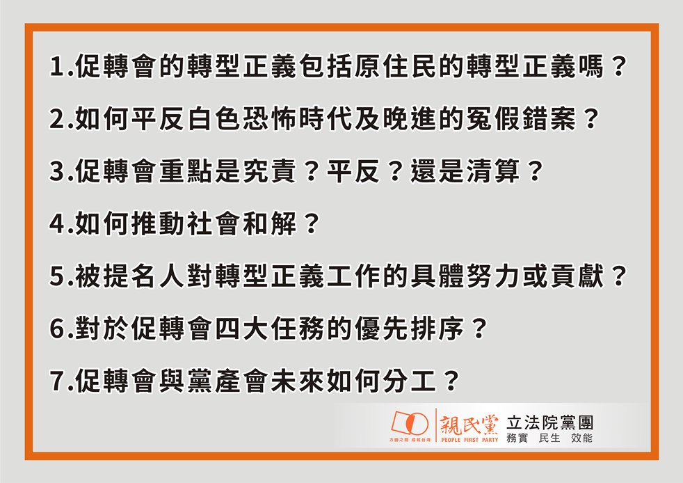 李鴻鈞總召強調,今天與九位被提名人會面,目的就是希望透過對話溝通,來瞭解未來實際運作促轉會的人,他的理念到底為何?因此,黨團這裡也準備了簡單的七道題目,給被提名人一週的時間回答,作為行使同意權的依據。完整題目如下: