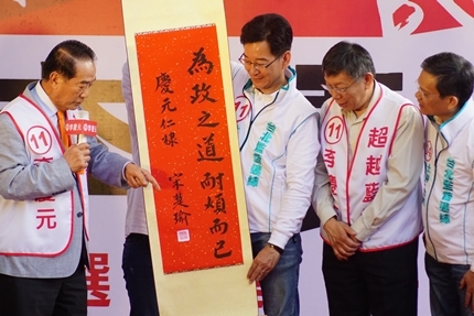 親民黨主席宋楚瑜今天下午為台北市大安文山區市議員候選人李慶元站台,他強調,每天捲到藍綠紛爭,讓大家都很辛苦,現在台灣需要一股新的力量,要有出色的政治團隊,台灣未來才有起色。宋主席並致贈親筆寫的中堂「為政之道耐煩而已」,期勉李慶元繼續秉持熱誠為民服務。