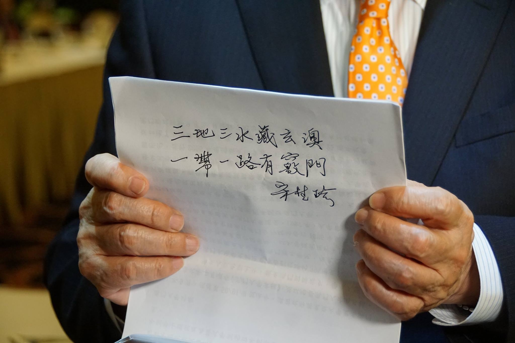 會面結束前,宋主席還送了一副對聯給崔世安先生。上聯是:「三地三水藏玄澳」,三地指的是深圳、香港、澳門,上聯中的「澳」,指的也是澳門。下聯是:「一帶一路有竅門」,「門」就是指澳門, 期許澳門在發展經濟的同時,能夠繼續以中華文化為基礎,進一步把中華文化復興,讓世界對中華文化刮目相看!