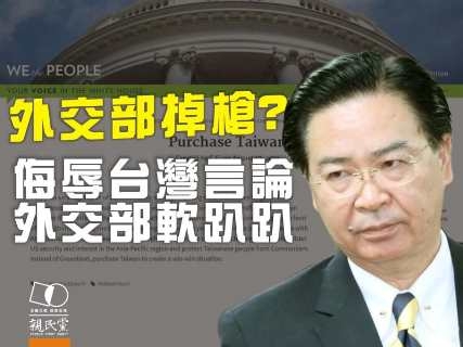 針對有美國網友在美國白宮請願網站「我們人民」發起「購買台灣」的連署書,親民黨團認為,外交部豈可軟趴趴,只回應「台灣是非賣品」就輕輕帶過,應該請駐美代表處立即向美方交涉,對於侮辱中華民國國格的提案,應立即下架。