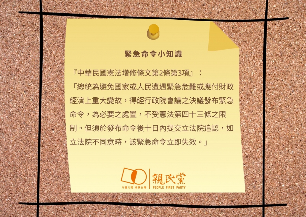 但上述種種做法、辦法均涉及人民的自由權。為避免與憲法所保障的基本人權產生牴觸,親民黨認為,政府可進一步思考研議,發布憲法位階的「緊急命令」送立法院追認。