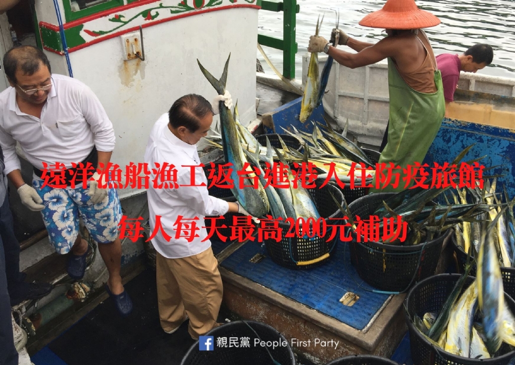自5月18日起,針對遠洋漁船回台部分,除了船上必要留守人員外,其餘都進入防疫旅館,不論船上、陸上,都必須採「一人一室居家檢疫14天」。考量遠洋漁業負擔大、漁民辛苦經營,針對船員上岸入住防疫旅館,將提供每人每天最高2000元的補助。