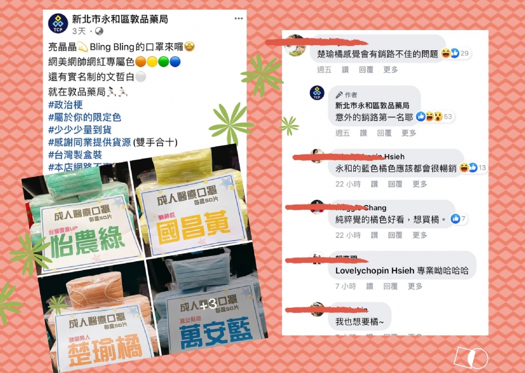 「新北永和有一家藥局,口罩還是超搶手,因為它一口氣推出6種顏色口罩,而且還搭配政治梗,像最常見的綠色就是「怡農綠」,藥局負責人說,加上怡農2個字後真的賣翻了,但賣最好的是哪個政治人物的「顏色」?帶你來看。」