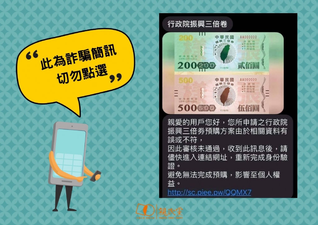 更讓人憂心的是,三倍券還沒上路,「三倍券詐騙簡訊」先開跑!利用詐騙簡訊來誘導大眾百姓進入詐騙情境。檢調單位應該立即速辦嚴辦,趕緊把這些沒良心的詐騙集團繩之以法,不要讓預購「振興三倍券」的民眾變成詐騙集團的肥羊!