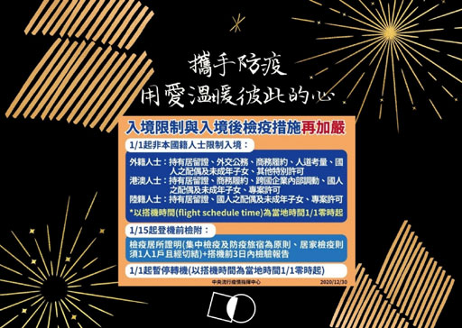 2020年倒數計時,一整年辛苦全民防疫,在英國變種新冠肺炎病毒的衝擊下,台灣自明日起也將開始「鎖國」一個月,迎接更積極的防疫作為。今天晚上地方各地的跨年活動多有異動,除台北市、宜蘭市、新竹縣、雲林縣、台東縣及澎湖跨年晚會持續進行外,其餘縣市已改為不開放民眾入場,鼓勵民眾線上觀看。若大家還是安排了外出參加聚會、活動,千萬要做足禦寒保暖,並加強防疫。(🎉跨年活動是否取消 各縣市晚會迎曙光異動一次看→https://pse.is/3bagde)