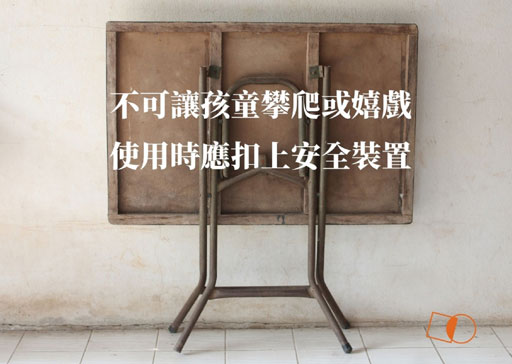 另外,也提醒大家,使用折疊桌時,務必將安全裝置扣上。使用完畢後,一定要收納好,立於小孩子不易接觸的地方。絕對不要讓小孩攀爬摺疊桌或在摺疊桌附近嬉戲,以免桌子瞬間折合,發生夾傷等致命危險。