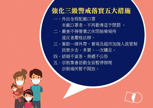 新冠變種病毒持續流竄!,昨日新增11例死亡,創疫情以來單日新高,全台短短4天已奪走29條人命!中央疫情指揮中心啟動「北患南送」機制,並宣布即日起加強「五大防疫措施」,包含:民眾外出未戴口罩直接開罰、餐飲一律外帶、結婚不宴客、喪禮不公祭、宗教場所暫不開放,及嚴查不得營業之休閒娛樂場所,違反者嚴格法辦。但「徒法不足以自行」,仍需要政府貫徹執行力與民眾共同遵守防疫,國人才能撐到疫苗抵台。