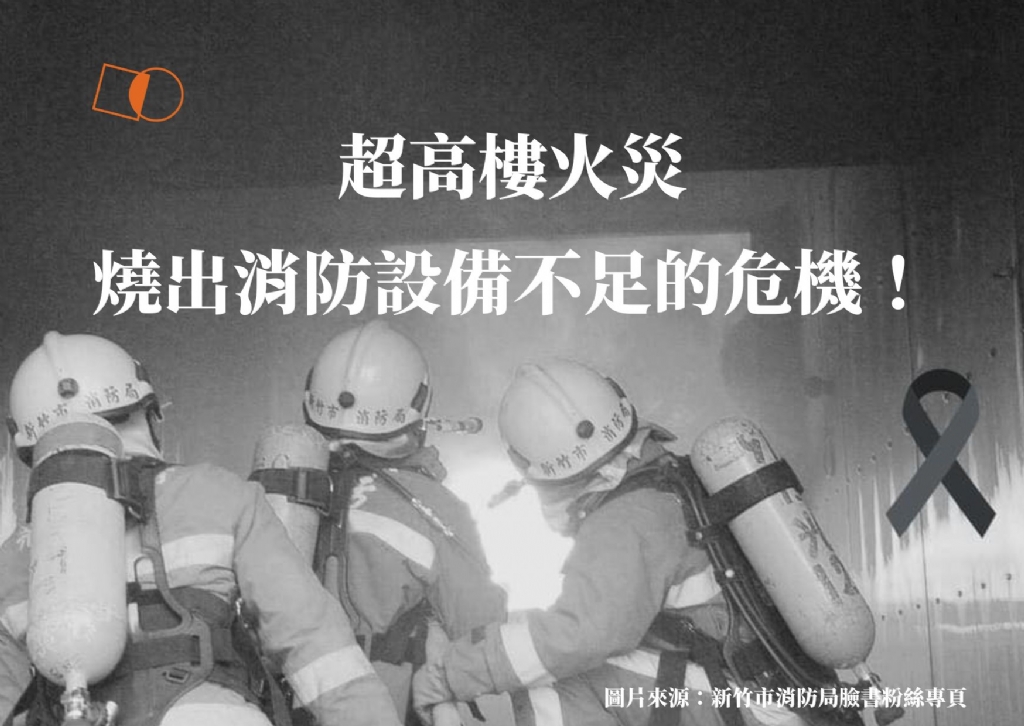 新竹市一社區大樓於大前天深夜發生火災,雖然351名住戶全數救出,但仍有60人嗆傷送醫,並造成2名消防員不幸殉職。顯見我們面對超高大樓火災防治經驗還是太少。政府必須負責任檢討救災勤務安全和更新裝備器材,否則如何做為打火弟兄的安全後盾?又如何確保人民生命財產安全?