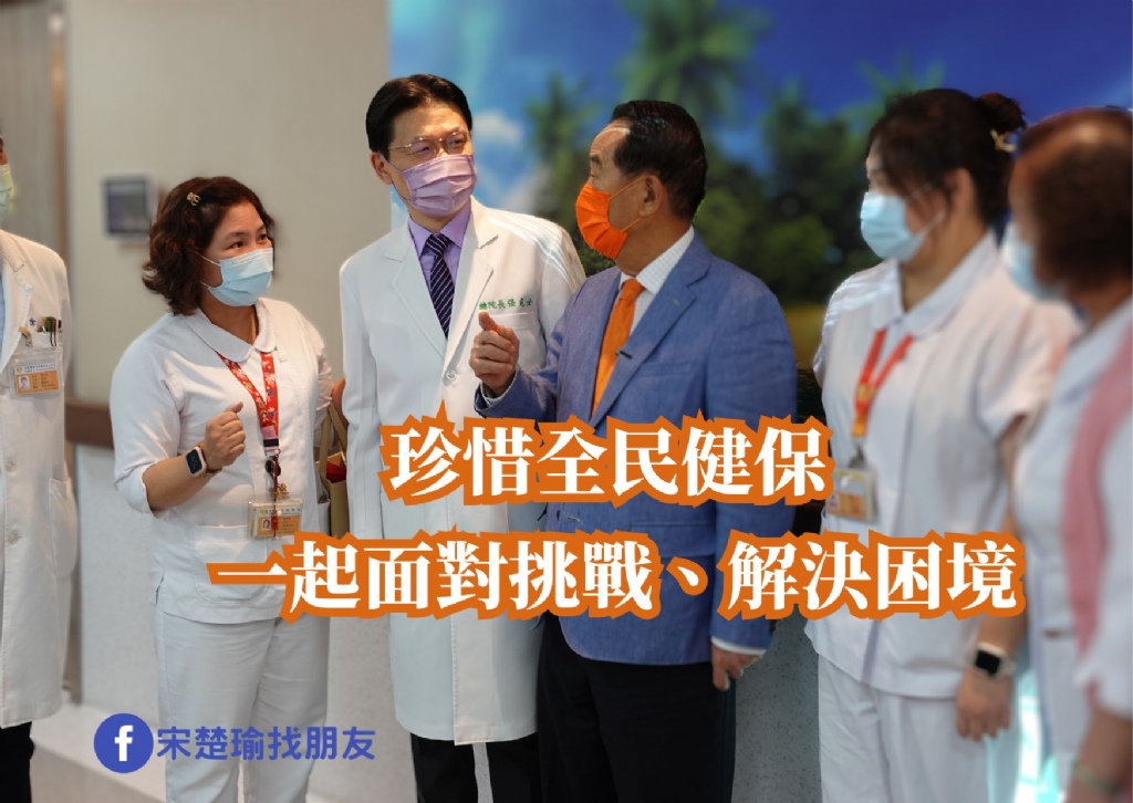 總結來說,前述的三大問題,絕不是衛福部單一部會就可以去解決的,因為牽涉到資源的調配,中央與地方的協調……等等,需要更高層級單位來調和處理。過去省政府對全省醫療制度的補強做過不少努力,宋主席擔任省長時常親自去協調、去整合資源,去解決問題,這才能讓全民健保能逐步走上軌道,積累永續經營下去的本錢。期待我們不僅要繼往開來,也要承先啟後,千萬不要大意,讓一個好的制度自毀長城,大家應該一起共同好好珍惜臺灣的這塊瑰寶--「全民健保」。一起面對挑戰,解決困境,讓臺灣好的制度能夠繼續永保安康!